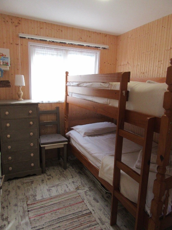 Sturdy wooden bunk beds, wardrobe space, chest of drawers, lamp.