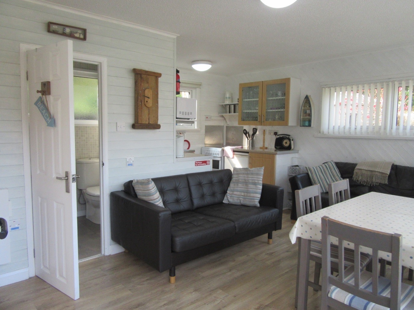 An open plan interior offers a kitchen area with fridge, cooker, microwave, toaster, cafetiere, all pots & pans, dishes and cutlery plus storage space for your food. Tea towel provided plus washing up liquid.